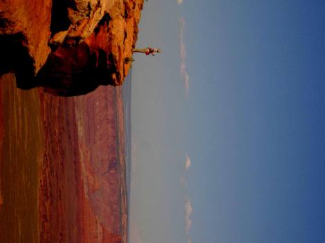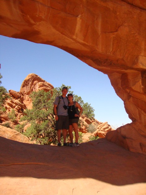 She says: After the drive through the Mountains of Colorado we entered Utah (land of the National Parks). The first National Park we came to was Arches.  The drive in was beautiful.  John kept stopping to take pictures and I never thought we were going to get there.  He thinks he is a professional photographer..my dad is the same way. Something about having big cameras…it’s definitely a man thing.  I just point and shoot with my little Cannon that fits in my pocket and seem to do alright.  Needless to say we got there in the evening so we set up for the night and planned our hikes for the next day.  We had a nice campfire and admired the stars overhead.  It was awesome- it felt like we were in a planetarium with the amount of stars and how close they seemed.  Arches was a pretty neat park.  We did a long hike in the morning and a couple short ones during the day.  I was amazed at the little kids doing these hikes.  Some parts were large drop offs with narrow walkways and no containment at all.  Oh to be a kid again and have no fear.. After the day in Arches we set off for Canyonlands National Park where we didn’t do a lot of hiking but drove through and went to all the view points…also very beautiful.  John said it was like Grand Canyon but on a smaller scale.  The only bad part was all the bugs..UGH our car was covered in them, it was pretty crazy.  We ended up stopping in a small town called Green River and set up our tent at a state park.  We took a shower, did some reading and hit the sack.