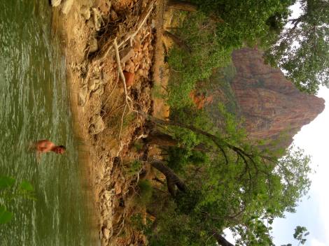 Off to Zion.  Since it was July 4th we stopped at the small town Kanab in hopes they may have a parade or something…and boy did they have a parade.  The streets were packed with people.  We grabbed our chairs and enjoyed the show.  We got some lunch at a really great restaurant in the middle of town and then drove to Zion.  It was another amazing park.  We wish we had longer to explore but we had reservations in Vegas so only got to spend one night there.  It was hot so the first thing we did was go for a swim in the Virgin River.  Then we went off exploring.  We tried to do as much as possible but couldn’t get it all in one day.  We will be back Zion.  We made a delicious dinner for a change at our camp.  Usually we eat tuna and baked beans…this night we made mango jalapeno chicken sausages and corn on the cob. It was a gourmet dinner for us and we were in heaven.  We made some friends that were camping across from us and invited them over for dinner but they had already eaten, more for us!! Later, they invited us over for some adult beverages and a lil music. Like us they were on a road trip but heading to Montreal so we had a lot to talk about. The party got dampened by a late night thunderstorm but they had some good suggestions for Cali which we are definitely going to check out.