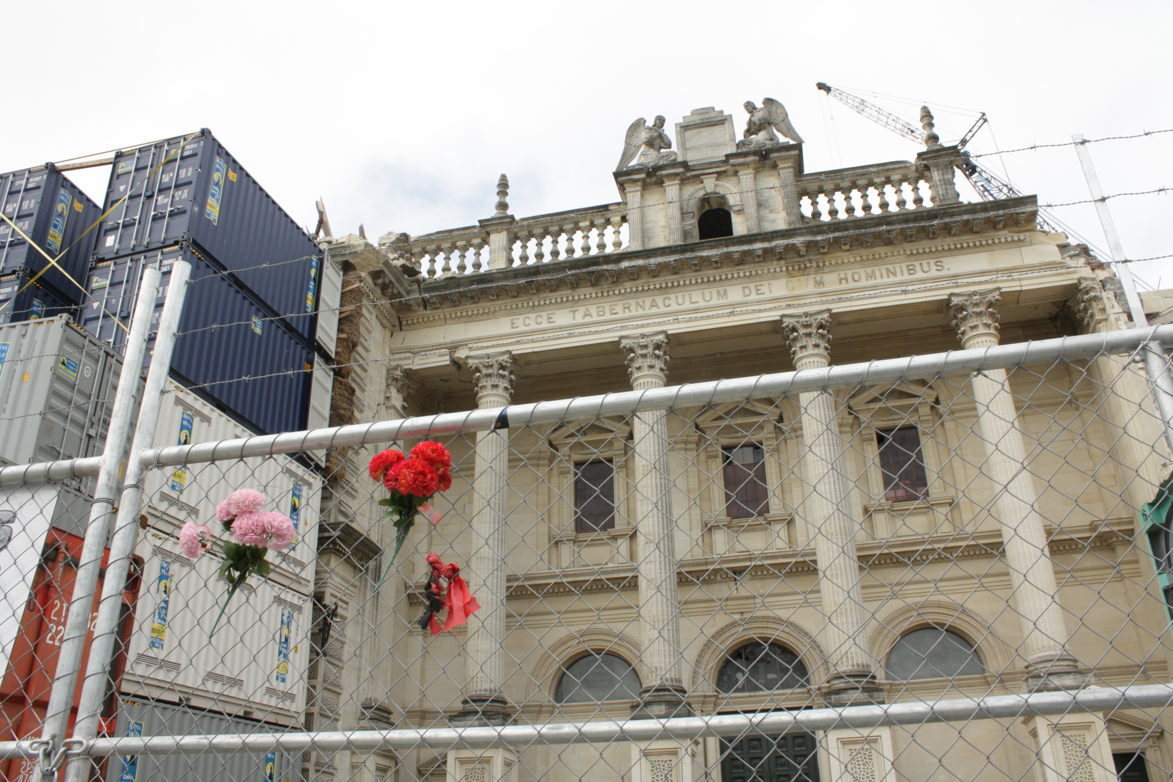 A landmark building in Christchurch they're still working on salvaging. The connex boxes to the left of the photo are literally propping up the building.