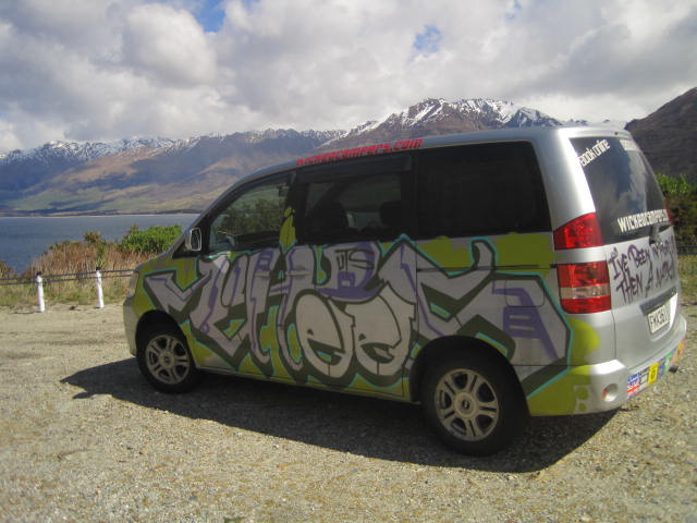 The next day Julie drove us back down to Christchurch where we arranged to rent a Wicked camper van for our South Island road trip. The van wasn’t lush accommodations but it was definitely eye-catching. Ours had graffiti spray-painted all over the sides and on the back it said “I’ve been in more laps then a napkin”. Yes, “than” was spelled “then”. In any case, it was nice to get on the road in style.