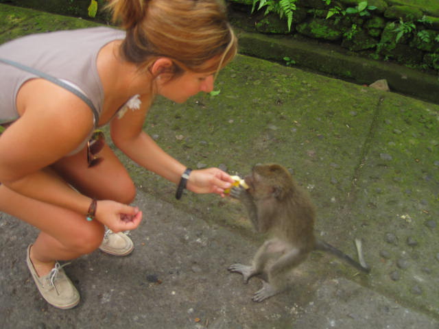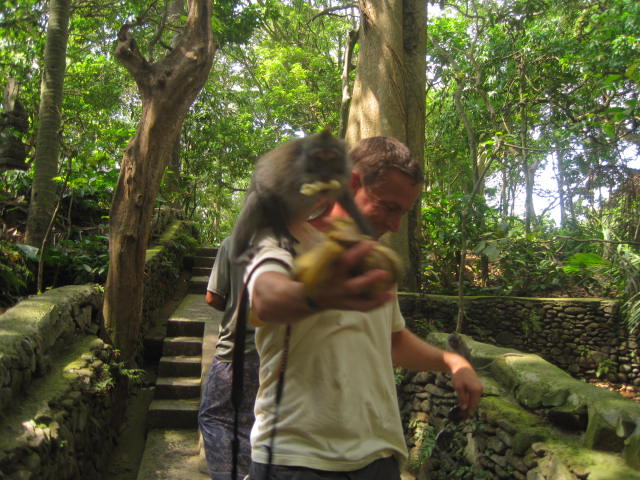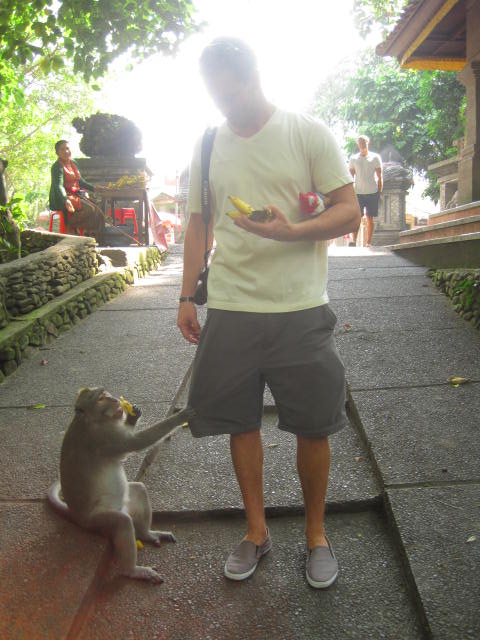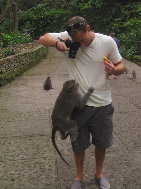I loved Ubud!! It was actually recommended to us from a friend of mine who went to Bali on her honeymoon.ย The hotel we stayed in was fantastic!ย We had our own private bungalow with air con, attached HUGE bathroom, TV (No English) and a really nice pool and gardens.ย Not to mention a complete American breakfast included.ย All for the bargain price of $22/night ๐ย Location was good as it was situated in town close to all the restaurants and the monkey forest.ย The monkey forest was definitely an adventure.ย I even got good video footage of a monkey humping another monkey to include love bites.ย It lasted all of 6 seconds.