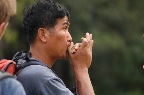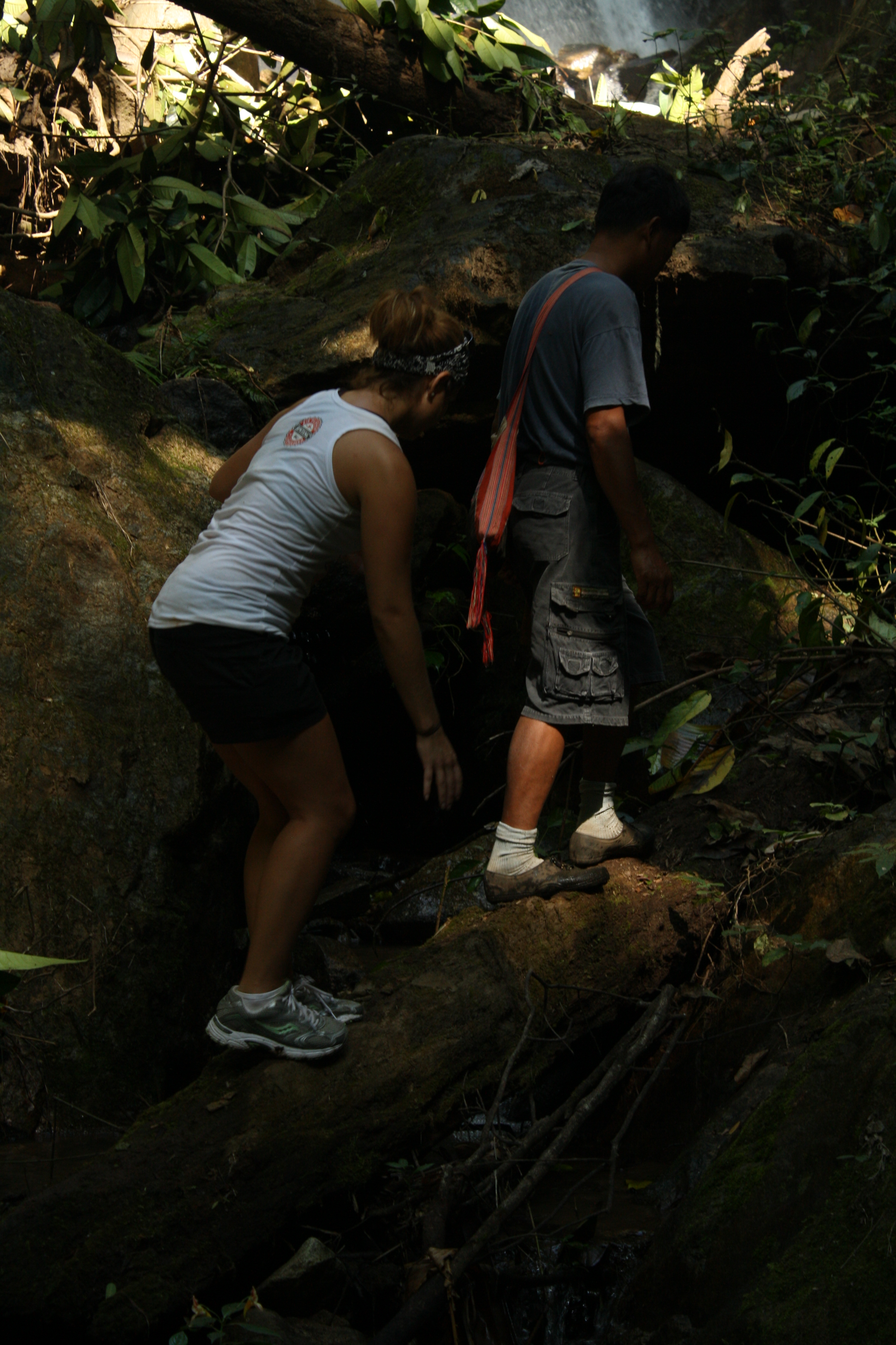 We woke up bright and early the next morning and met up with Pat to go trekking. This is when you go on long hikes through the jungle/forest and stop at the local villages along the way. You can go for one day or a few days. We decided to be a little adventurous and do a two day trek so we could stay at a village for one night. We were glad that we waited until Pai Β and lucky that we got Pat as our guide. It was an amazing trip and, I think, better than what most trekkers get to do. The actual hiking was good in itself and would have been worth the money. Pat’s motto was “If it’s not difficult, you won’t remember it.” We remember it. We climbed up steep hills then slipped and slid down their other sides; we forded streams and walked across rickety bamboo bridges (which Pat had to strengthen with palm strips); we clambered over craggy boulders almost twisting our ankles and walked along ridges that fell over 50 ft to more craggy boulders; water buffalo watched us carefully as we marched through their rice paddies; and we learned how to make a bamboo lighter. We were pretty sore and tired by the end but it was an awesome experience for everyone… except maybe our Swede companion who decided to hitch a ride rather than hike back to Pai the following day. πŸ™‚