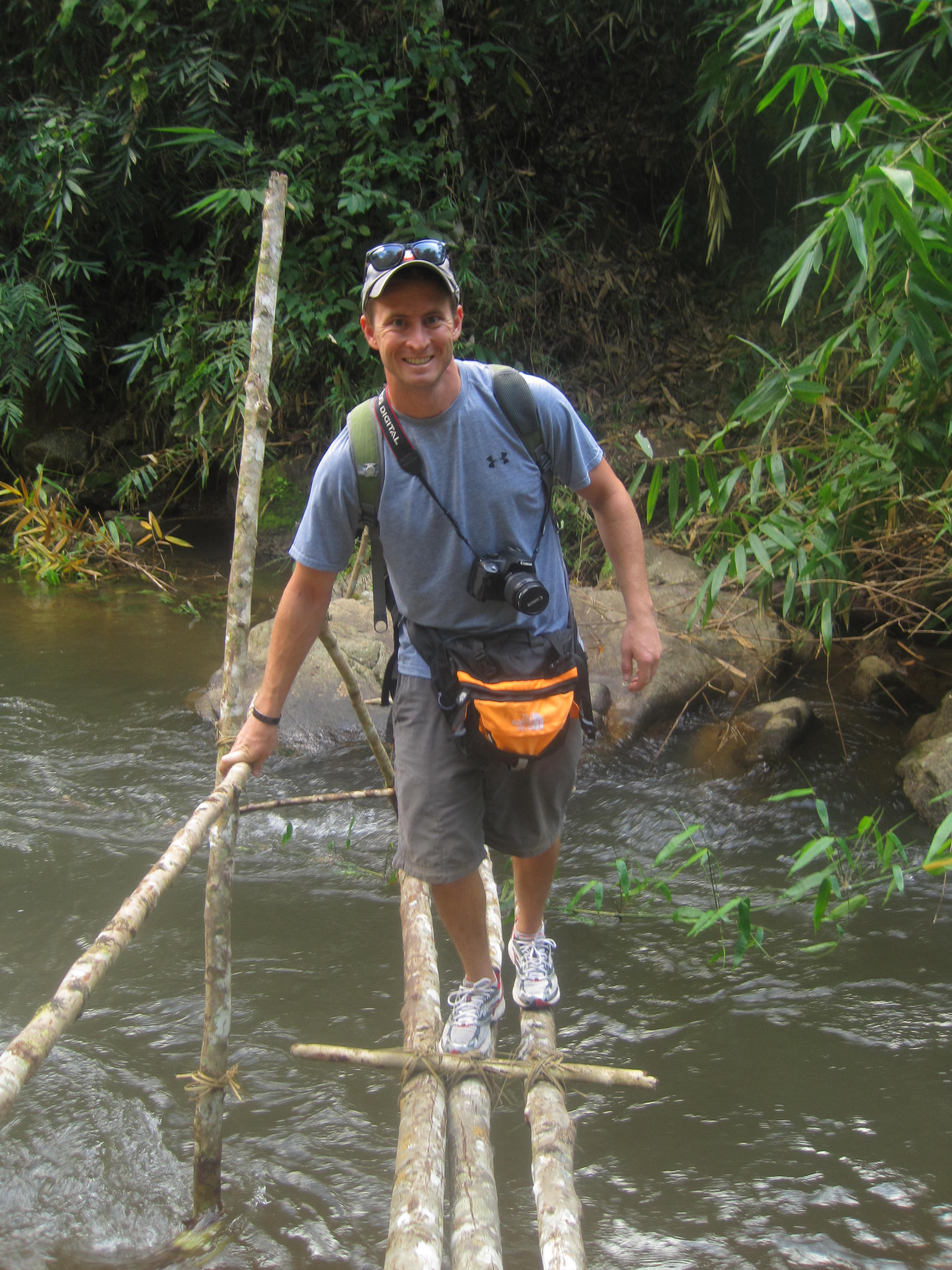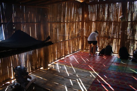 The best part of the trek for me was staying at the Lahu village. Β We were apprehensive how the village would be considering our experience in Chiang Mai with the long neck village. Β However, this was completely different. Β After about 5 hrs of traversing through dense trees, waterfalls, and river crossings we arrived to a clearing at a hill top. Β Down below was a small village with a dozen or so thatched houses, chickens, pigs, puppies, and little kids running around. Β There was one dirt road through the village and a river stream at the end. Β To me it almost felt like Utopia. Β It was so simple, beautiful and serene and seemed like a perfect ending to the day’s journey.