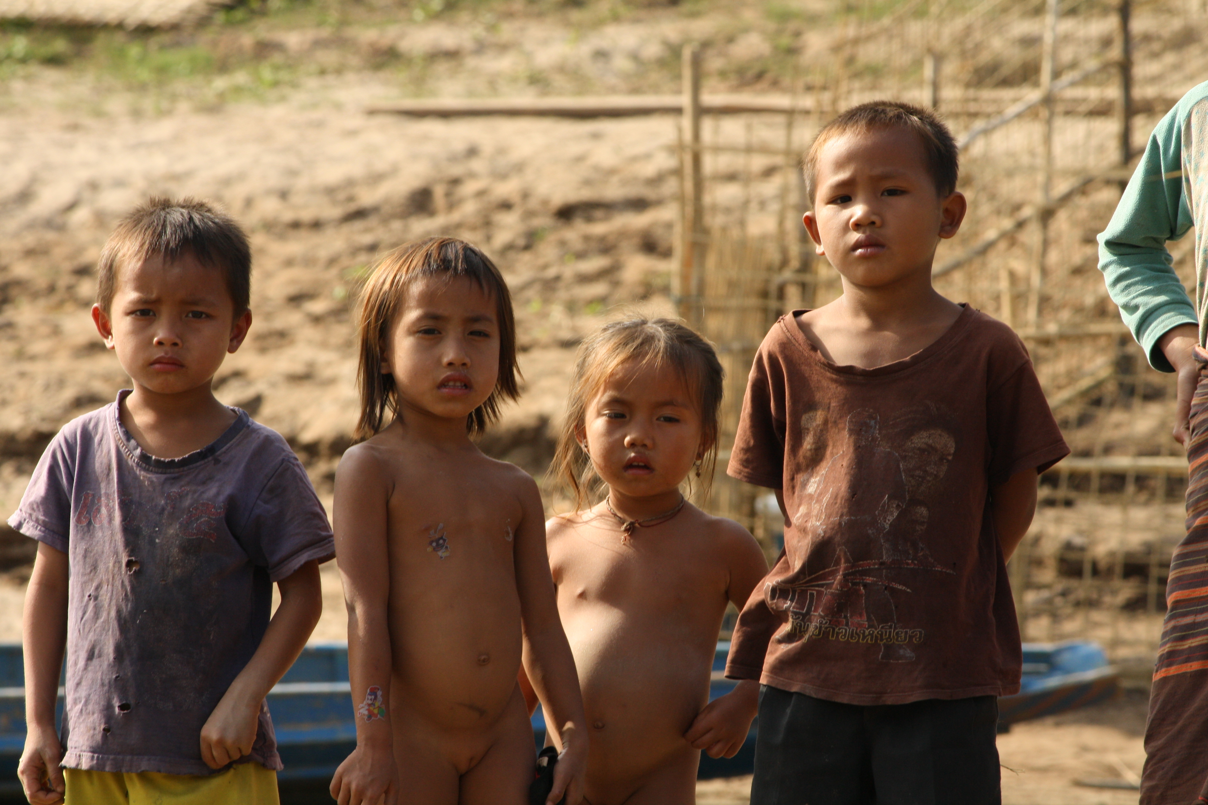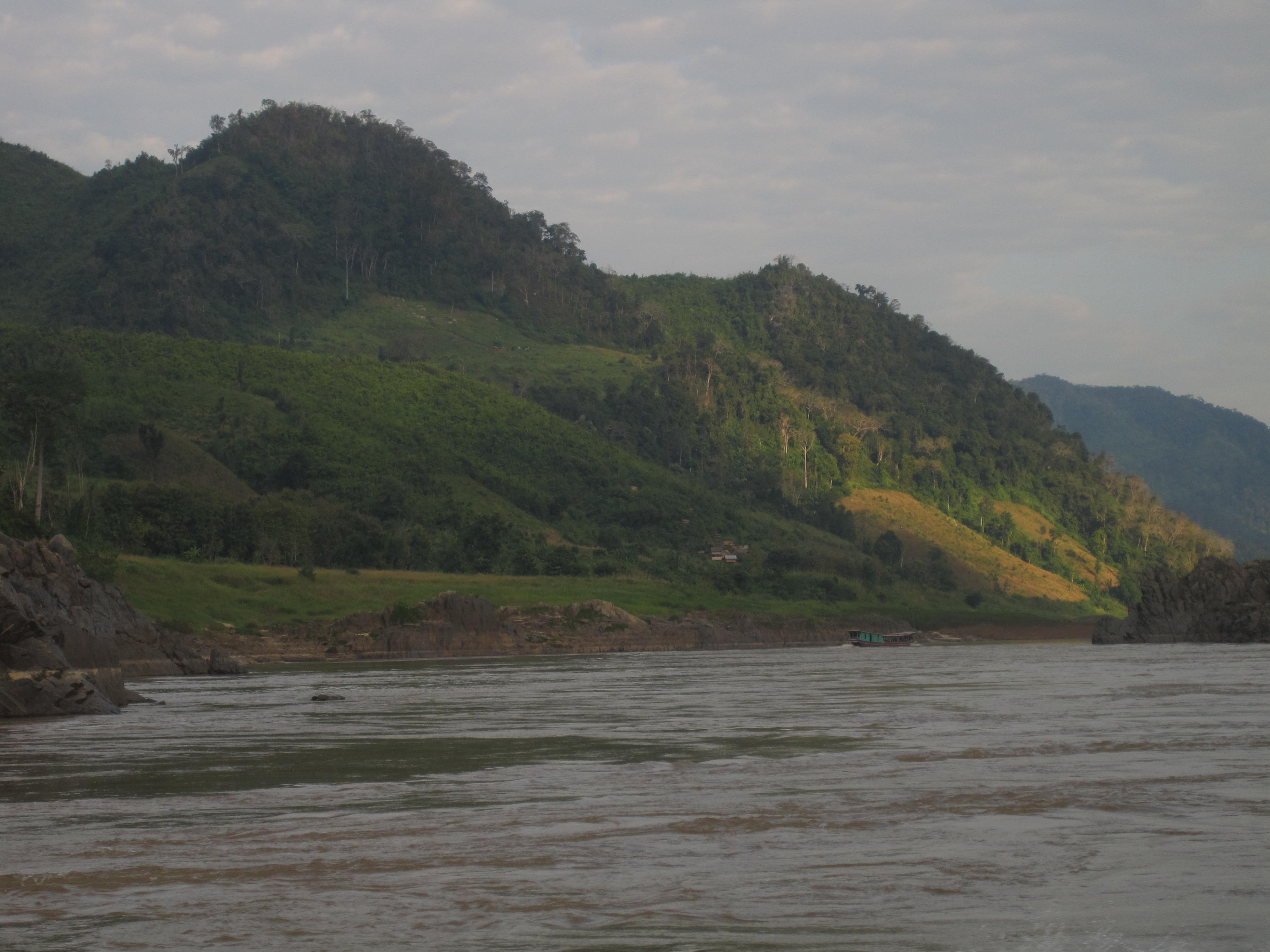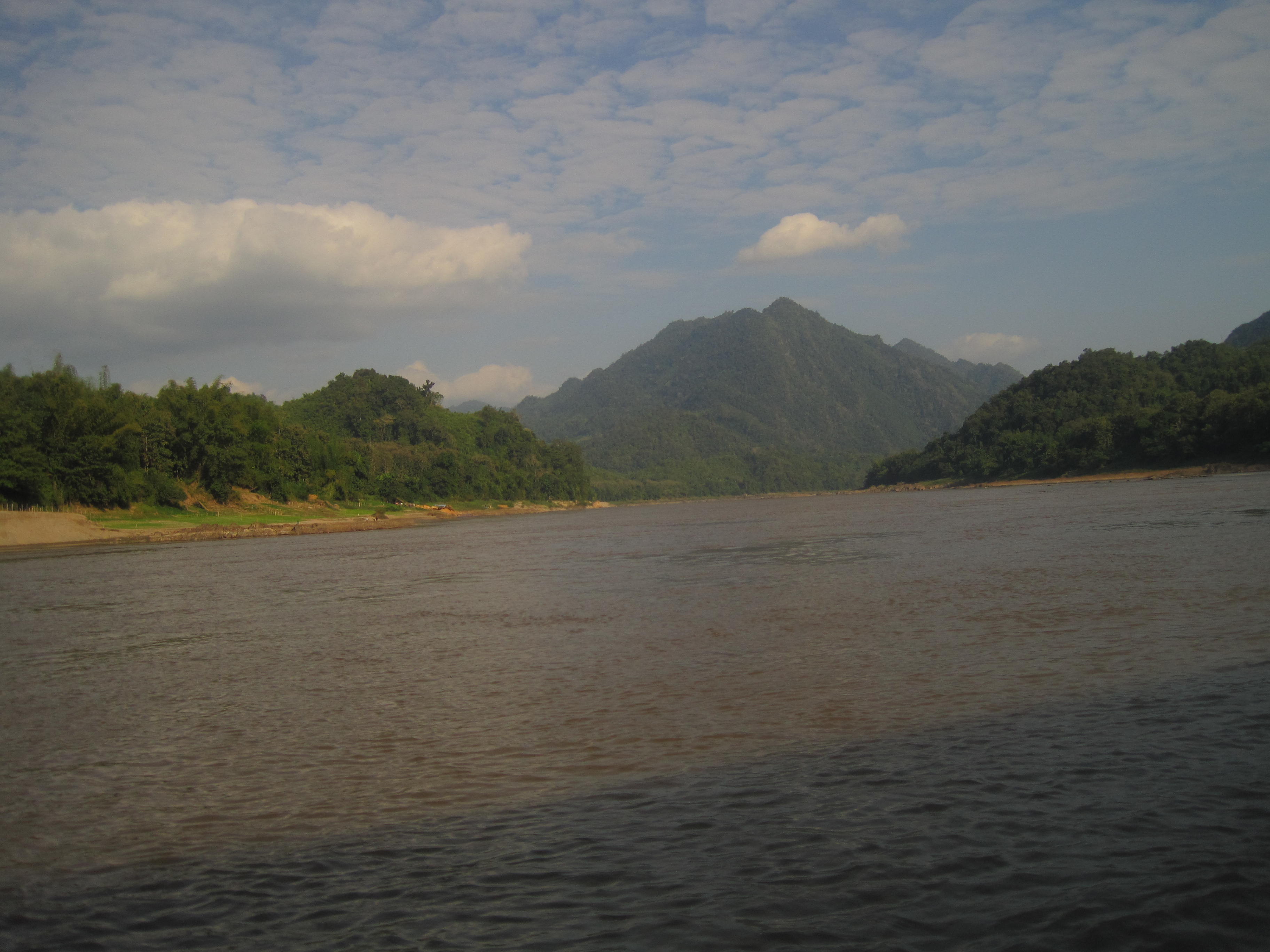 The boat cruise took two days.  The first night we stopped at a small fishing village right off the Mekong.  We stayed in a pretty nice bungalow right on the river for about $9.  The next morning we arrived to the boat early to try and get a good spot.  The boat we were loaded onto didn’t have a back area and we instead got a seat this time.  The landscape of Laos is absolutely beautiful!  I had read that about 80% of Laos is still uninhabited.  The countryside is very picturesque; very lush and green with rolling hills.  There are small villages located all along the Mekong.  Our boat often pulled over to drop off supplies to many of them.  The little village kids would often come running out to greet the boat or just wave.  Many times they had no clothes.  I think I was like that when I was a kid as well.  I don’t think it’s until you are about 13 that you begin to like clothes.  Heck, I’m not sure I like them now, however, my closet at home would beg to differ 🙂