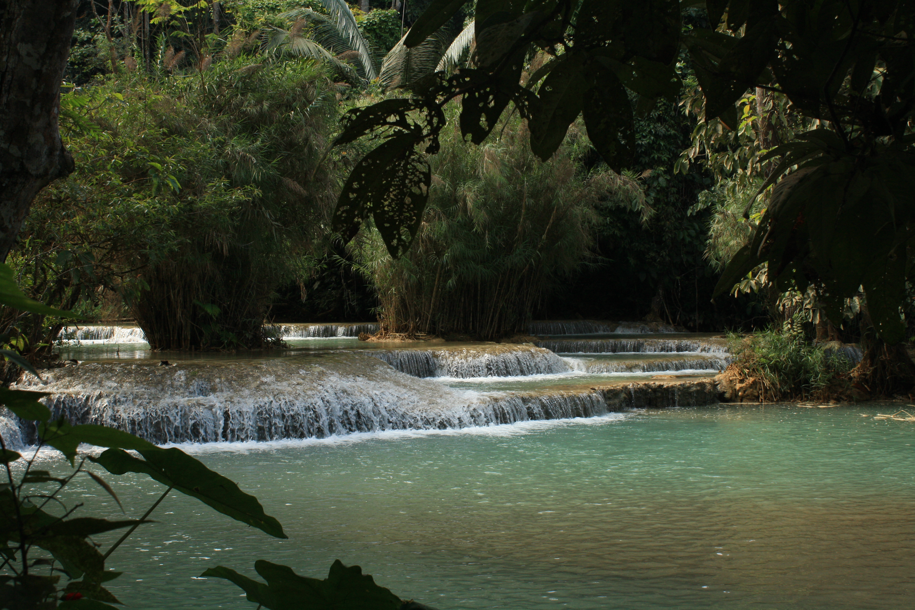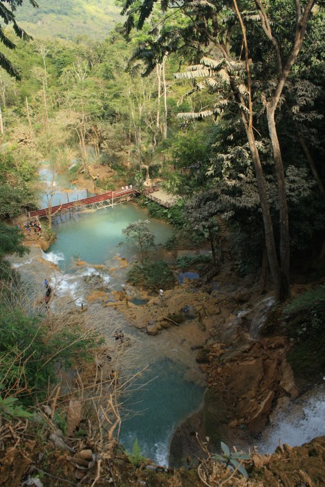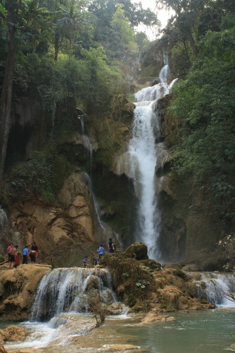 The best part of LP for me was Kuang Si Falls.  These waterfalls were located about 20km from the city and were gorgeous!  I had never seen anything like them.  The best part was a rope you could swing and jump from into a lagoon you could swim in.  I told J that a place like this was on my bucket list.  I had always wanted to find a hidden oasis where waterfalls landed into a beautifully colored lagoon that you could swim in.  This place was exactly as I had imagined, maybe even better!  It was completely out of a movie.