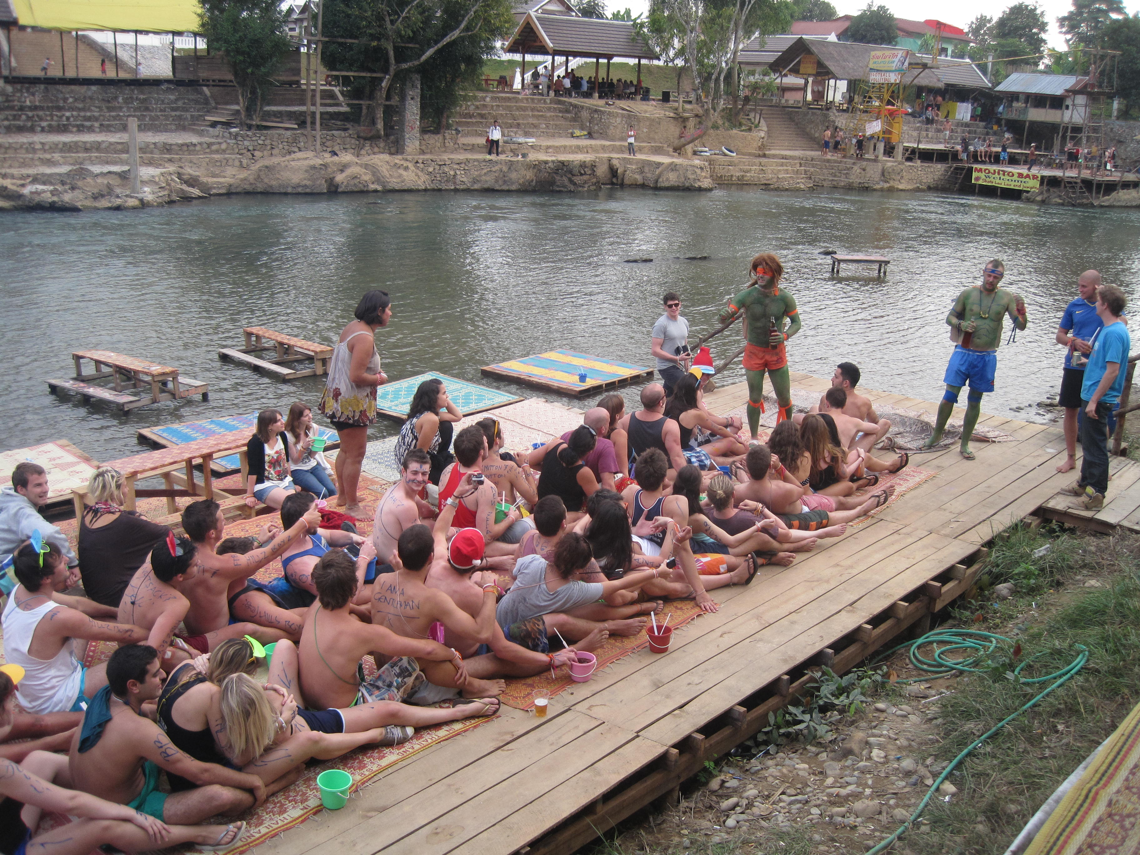 After LP we took another bumpy, curvy bus ride to Vang Vieng. I have to say I don’t agree with TB’s description of VV as a laid back hippie town. It was more akin to a Spring Break party place, but instead of beaches there were rivers surrounded by huge cliffs. The only hippie thing about it was the scent of weed floating around every corner. If you read a description of VV in any travel guide you’d find that “tubing” is the major attraction. The travel guide will explain that tubing is where you leisurely float down a shallow river that has bars situated on either side. As you float through you stop at each bar and drink plenty of Beerlao and the local version of whiskey…and so the ride ends up being not so leisurely. If you continue reading, the travel guide will then warn you that each year at least a few careless travelers are killed from drinking too much and drowning in the river. Go to Youtube and search for Vang Vieng, you’ll understand why.