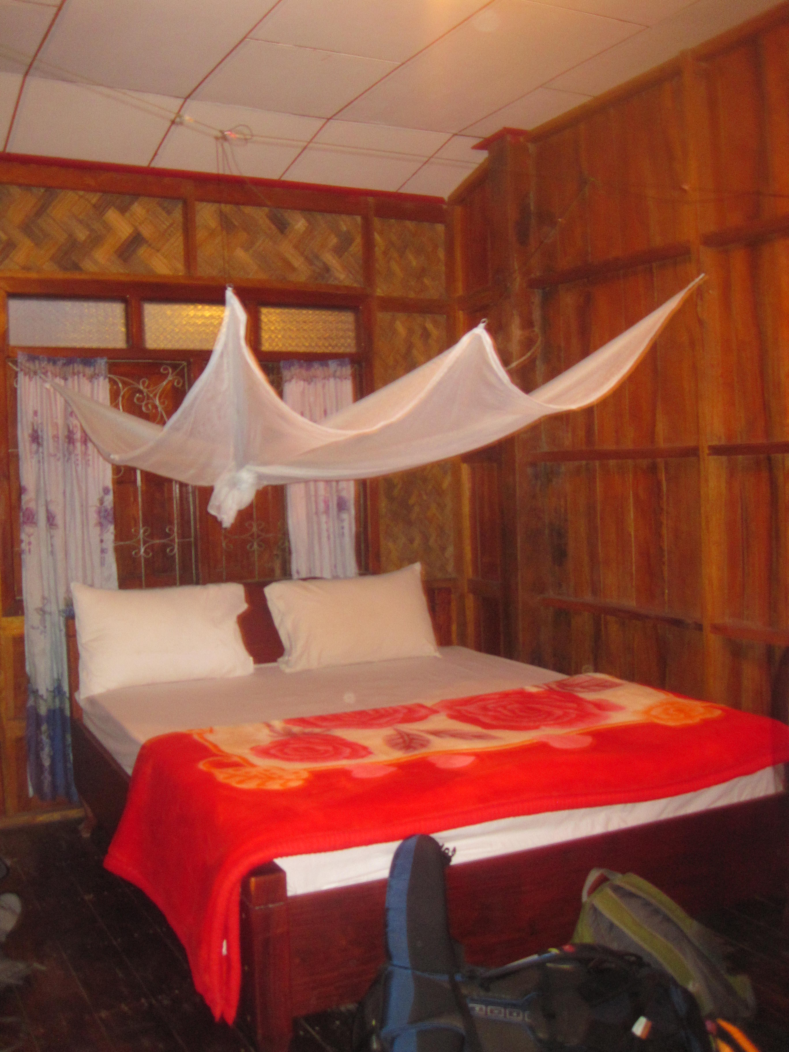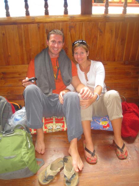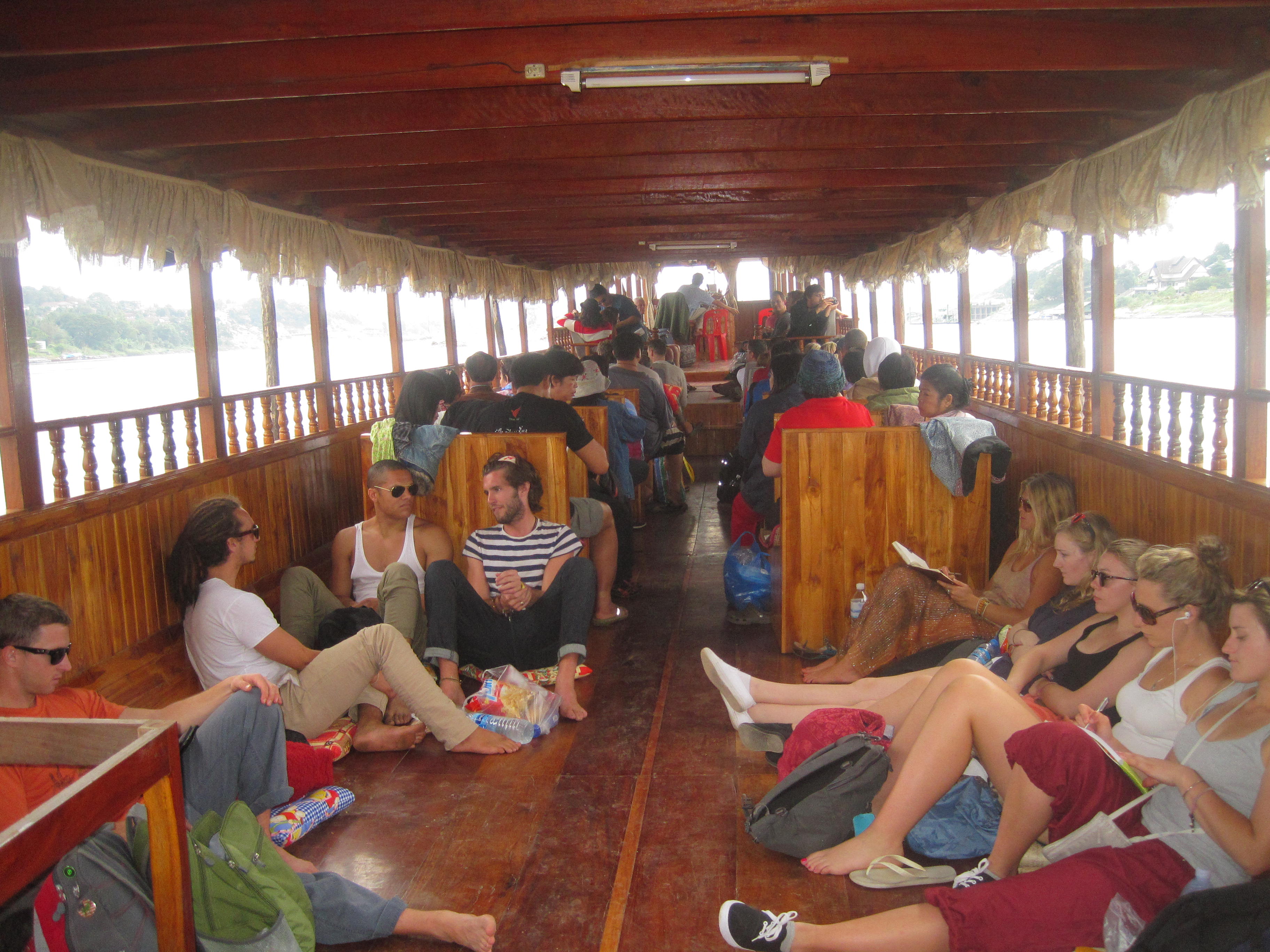 She says: The trip to Laos was definitely an experience.  It started with the worst van ride EVER!  John and I have been on some pretty windy, curvy roads throughout our travels, but nothing like this.  I am pretty sure I felt sick within the first 20 mins of our 5 hr ride.  I swore I was going to have to request the driver to pull over a couple of times.  My saving grace was the 7/11 we stopped at for a potty break.  Thankfully they had motion sickness pills.  THANK GOD!  They allowed me to endure the last 3 hrs or so.  Around 245am we arrived at a rather drab hotel where we were to sleep until about 630am.   Surprisingly J and I got our own room.  We both slept with our clothes on as this hotel was about as nice as the $29 mistake we stayed at in Miami, FL.  Bright and early the next morning we were picked up and stuffed into a little pick up truck and taken to breakfast.  After breakfast we had a series of immigration stops before we arrived to our slow boat.  I don’t mind the red tape so much, it was the picking up and dropping off of our packs about 15 times that really started to annoy me.  We were told by our travel guide that we would arrive at the boat early so we could get the good seats. Nope didn’t happen.  Our group was the last to arrive and didn’t even have seats!  Fortunately we bought pillows to sit on and we think ended up better than the seats.  We had the entire back of the boat where we could stretch out or stand and enjoy the scenery of the mighty Mekong River.